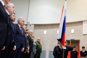 Копию боевого знамени 1548-го тяжелого самоходно-артиллерийского полка Денис Моисеев передал генеральному директору публичного акционерного общества «Магнитогорский металлургический комбинат», заместителю председателя Законодательного Собрания Павлу Шиляеву.