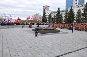 После традиционной минуты молчания председатель Законодательного Собрания Владимир Мякуш, губернатор Михаил Юревич, глава администрации города Сергей Давыдов и почетный гражданин Челябинской области, ветеран Великой Отечественной войны Евгений Куракин возложили венки к Вечному огню.
