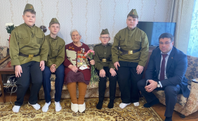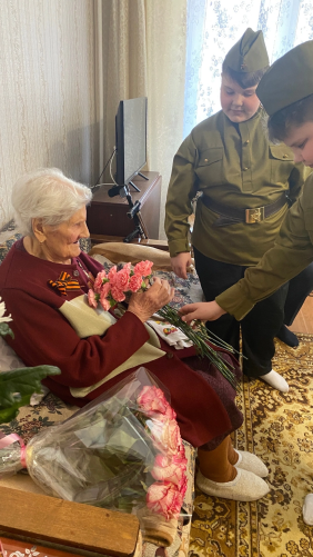 Для Александры Петровны Кузьменко, участницы Великой Отечественной войны, День Победы начался не совсем обычно – с небольшого концерта. Музыкальный подарок подготовили воспитанники детской школы искусств. Ребята пели песни военных лет, а Александра Петровна им подпевала! Это был настоящий праздник!