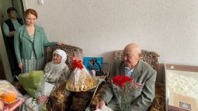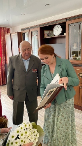 С праздником Великой Победы ветерана войны и труда, кавалера двух орденов и четырнадцати медалей Гарипова Фарита Курмановича поздравила депутат Лена Колесникова. Фарит Курманович ушёл на фронт добровольцем, когда ему едва исполнилось шестнадцать. В декабре 1944 года, после краткосрочных курсов в Свердловском танковом училище, получил самоходную установку и направление на Белорусский фронт. А в марте 1945 года отбыл на Дальний Восток. Вместе с супругой Маснией Шарафутдиновной, они прожили 75 счастливых лет, воспитали шестерых детей, десять внуков и десять правнуков.